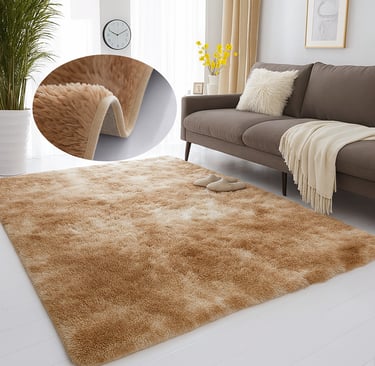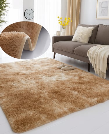 Tapete felpudo bege em uma sala moderna com sofá marrom, planta decorativa e detalhes aconchegantes. R$115,90 45% OFF R$62,90
